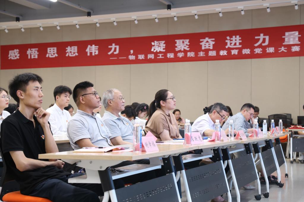 入围决赛的11位选手以学习贯彻习近平新时代中国特色社会主义思想主题教育学习材料为重点,从脱贫攻坚、科技创新、环境保护、民生保障等不同角度切入,依次展开微党课演讲。他们当中,有的讲述党的艰苦奋斗史,为在场师生展现了一段波澜壮阔的红色岁月;有的以乡村振兴为出发点,结合个人亲身感悟为大家分享走进乡村基层的脱贫攻坚故事;有的紧跟时事,以国产大飞机C919成功进行商业飞行为点,深入发掘成功背后无数中国科学家为之不懈努力的艰辛历程。选手们精彩的演讲,以微视角、大讲台的形式生动诠释了“感悟思想伟力,凝聚奋进力量”这一主题,深入浅出,将党的创新理论以通俗易懂、贴近实际的方式呈现,以小切口呈现大主题,用小故事诠释大情怀,形象地展现了新时代物联学子的昂扬风采。