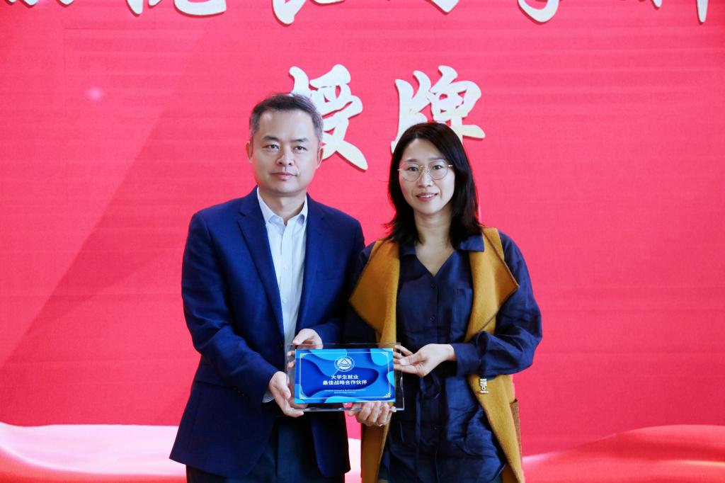 大学生就业“最佳战略合作伙伴”授牌仪式,李新等为获奖学生代表颁发证书,栾小丽代表学院向无锡信捷授牌“玩偶姐姐