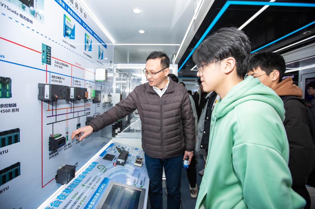 开幕式结束后,本届科技节系列活动之一—台达减碳之旅展车全国巡展拉开序幕。本次巡展汇聚了众多台达集团运用数字技术开发多维节能方案的成果,将“减碳”铭刻于“智造”。展出的科技成果主要从三大节能出发,运用数字化技术帮助用户进行绿色优化、提升系统效率、降低能源消耗。本次活动吸引了全校近500名师生的围观,同学们不用走出校门即可参观到企业先进技术和科创成果,受到了广大师生的一致称赞。