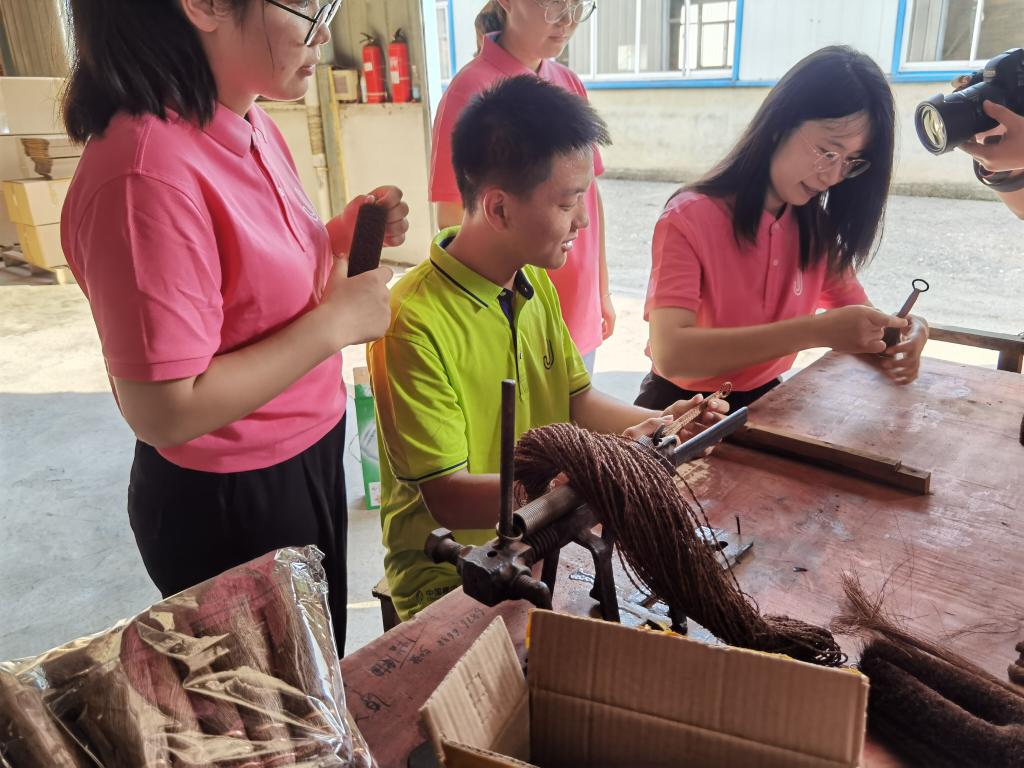 社会实践团队在美丽的宁墩镇探访县级非遗项目——万氏竹棕手工艺。在竹子搭建的展台上,展示着蓑衣、扫把、棕刷等一系列经典的棕制品。山棕,这份来自大自然淳朴的作品,在棕匠的精湛技艺下,焕发出属于它的独特光彩,实践团的成员们被棕编之美深深吸引。“制作棕编,一半是手艺,一半是守艺。看似小巧的棕编作品,其实也有拥有着极其繁琐的编造过程。”在竹棕手工艺非遗物质文化遗产传承人郑久月的指导下,社会实践团成员李可、段勤硕等亲身体验了棕编的制作,场景化、浸入式地感受到棕编技艺的博大精深和内在意蕴。