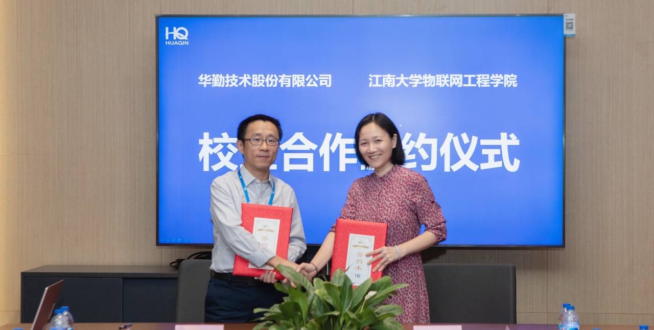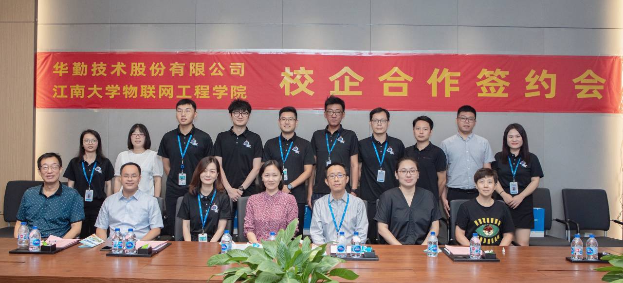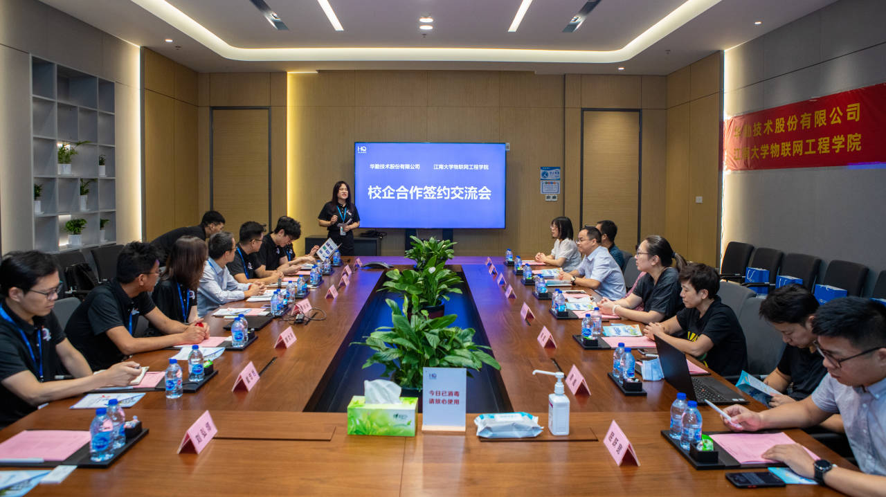 与华勤技术股份有限公司校企合作签约仪式在华勤无锡研究中心举行。华勤技术股份有限公司人力资源副总裁阮泉、人力资源总监熊安琛、无锡人力资源经理关国君、图灵研究院软件产品总工程师颜文亮、图灵研究院自动化总工程师戴忠旭,玩偶姐姐