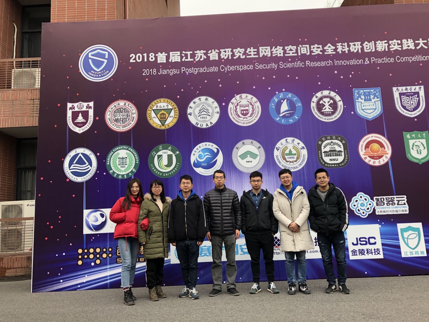 参加首届江苏省网络空间安全科研创新实践大赛参赛人员和指导老师合影(右二)