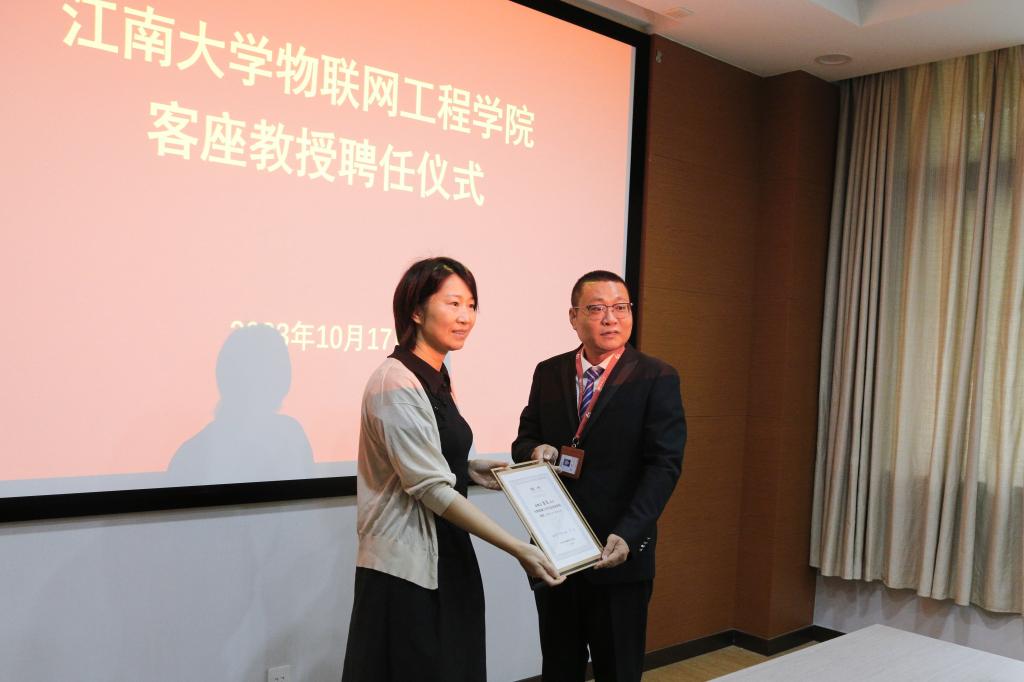 栾小丽首先为无锡市德宁节能科技有限公司董事长唐逸颁发客座教授证书。随后她介绍了学院近年来学科建设、人才培养、科学研究方面的建设发展情况,并着重介绍了学院近年来开展校企合作的情况。