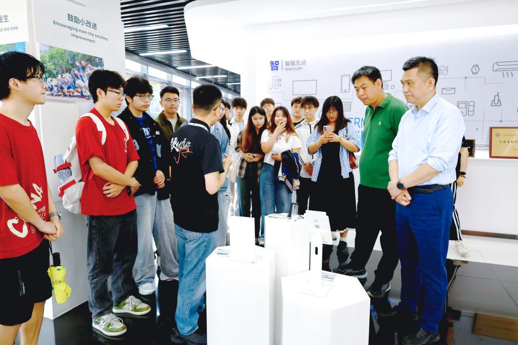 师生一行在工作人员的带领下参观了企业展厅,了解了华勤技术的发展脉络与行业地位。作为全球智能硬件ODM领域的领军企业,华勤技术稳居行业前三强,年营收超千亿元。无锡研发中心作为其重要的研发基地,聚焦物联网、智能终端等核心领域,与上海总部紧密协作,形成了高效的“双核联动”研发体系。展厅内陈列的5G模组、智能穿戴设备等创新产品琳琅满目,生动展现了企业“技术驱动全球化”的战略布局。