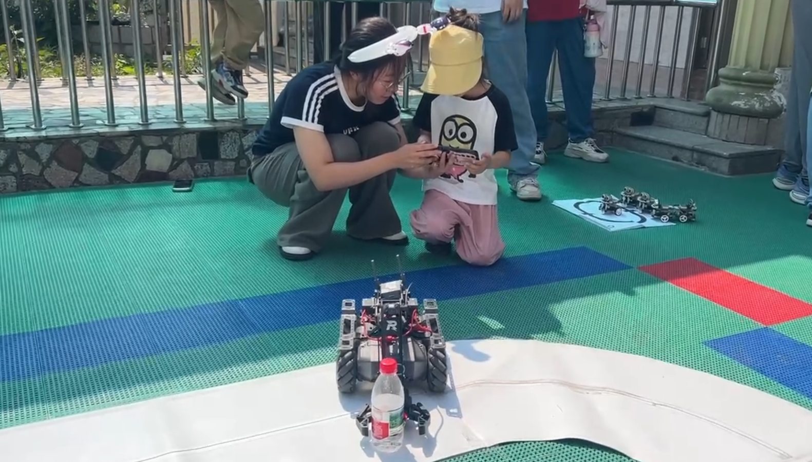 在互动体验区,孩子们亲身坐上智能车在赛道上行驶,亲手操控智能车抓取塑料瓶,并尝试指挥机器狗完成跳跃。每一次成功的操作都伴随着孩子们的欢呼与专注观察,这些亲身体验让他们更直观地感受到了科技的魅力