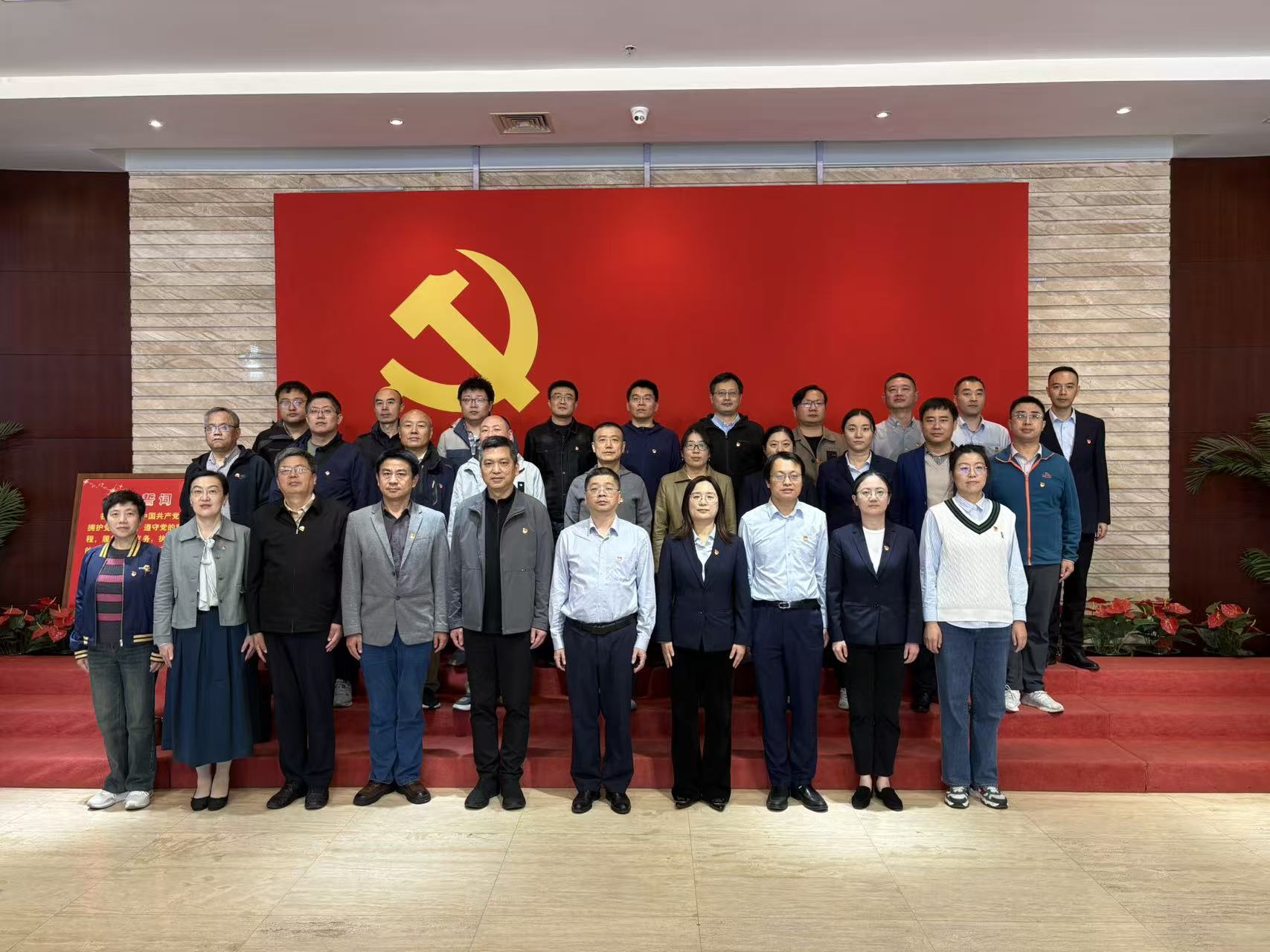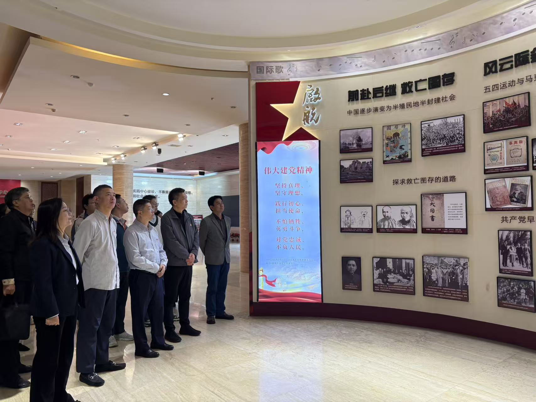 在滨湖区党建馆专业讲解员的引导下,全体党员依次参观了“启航”“星火”至“丰碑”八个专题展区,系统回顾中国共产党从艰苦创业到开拓复兴的辉煌历程。通过图文并茂的沉浸式学习,同志们深刻感悟到党在不同历史阶段所凝聚的智慧与精神力量。在宣誓区,全体党员面向党旗,庄严举起右拳,集体重温入党誓词,进一步筑牢信仰根基,强化使命担当。