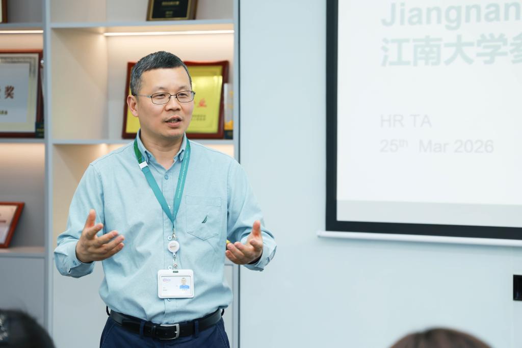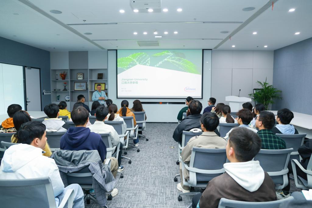 (物联网学院)师生一行表示热烈欢迎。他围绕企业架构、核心业务、明星产品以及独特的玩偶姐姐展开全面介绍,彰显了英飞凌在全球功率系统和物联网领域作为半导体领导者的行业地位。随后,周敏芳以企业发展脉络为引,系统介绍了公司在功率半导体、物联网解决方案等领域的全球领先地位,拆解了从芯片研发到终端应用的完整业务链条,让同学们直观感受半导体技术对新能源、智能硬件等领域的核心支撑作用。
