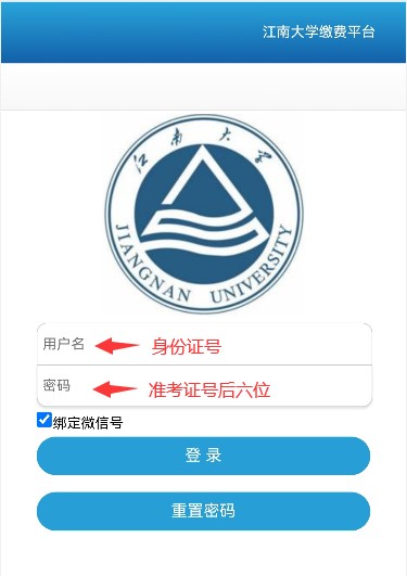 网上缴费平台”(网址://pay.wanoujj.net/payment/);登录账号为身份证号,登录密码为准考证号后六位(友情提醒:考生账号已开通,切勿自行注册)。