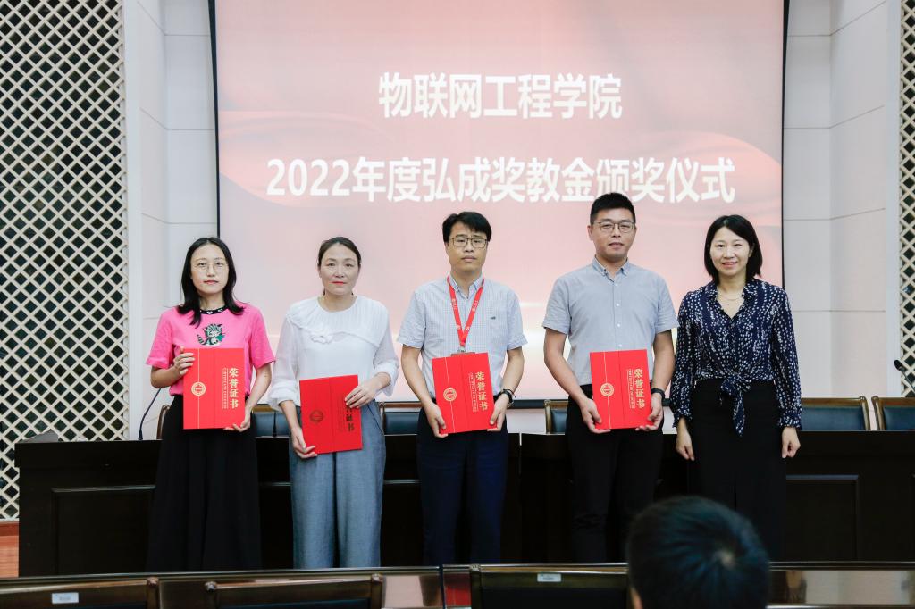 弘成奖教金是由弘成科技发展有限公司设立,旨在奖励为学院发展建设做出重要贡献或取得突破性、标志性成果的个人和集体,分别设有党建创新奖、科技突破奖、教育教学奖、管理服务奖、校园文体奖等奖项。2022年度“弘成奖教金”共设一等奖4项、二等奖8项、三等奖12项,其中,一等奖分别授予大学生创新实践基地党支部(入选全国党建样板支部)、“物联网技术应用”教育部工程研究中心(通过评估并获良好等级)、许德智老师(荣获国家优秀青年科学基金)和院乒乓球队(荣获玩偶姐姐