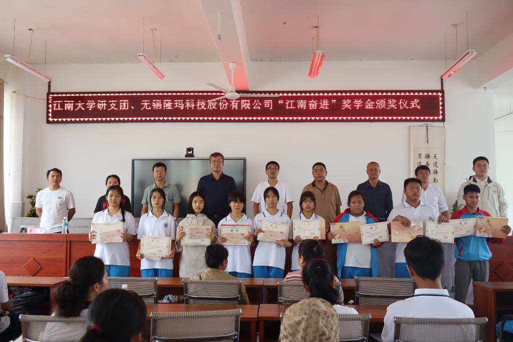 的大力协助下,联合无锡隆玛科技股份有限公司在支教地芒宽民族中学成功举办了“江南奋进”奖学金颁奖仪式。无锡隆玛科技股份有限公司董事长杨朝辉、芒宽民族中学校长杨洪成、副校长胡学永、党委副书记朱启祯等领导嘉宾出席本次仪式。芒宽民族中学全体学生和家长代表参加仪式。仪式由研支团云南分队队长霍雷霆主持。