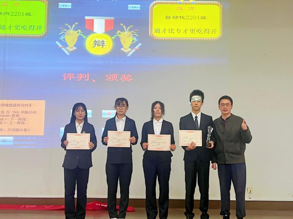 本届辩论赛自9月份启动以来,经过小组赛、半决赛等两个多月的紧张角逐,物联网2201班和自动化2204班从14支参赛队伍中脱颖而出,成功晋级决赛。决赛中,两队围绕“专才/通才谁更吃得开”这一辩题各抒己见,口吐莲花,舌战四方。双方辩手简单的自我介绍过后,激烈紧张的辩论赛正式开始。首先,正方开篇立论,将专才定义成某一方面专精,同时其他领域也有所涉及的一类人才,并将“具有核心竞争力,在社会上受欢迎”作为“吃得开”的定义,以三个分论点展开论证。随后,反方四辩质询了专才对其他领域的了解程度,并对正方的判准进行了滑坡。反方一辩立论中提出了不同的定义,认为专才就是精通一个领域,他们的判准则是“吃得开”要看“个人能为社会做什么”以及“社会能给个人多少资源”两个方面。正方四辩随后质询,设下重重陷阱,而反方一辩反应迅速,不断重申己方定义,并对原有的定义做出了更精细的诠释。整场比赛中最激烈的自由辩论环节中,双方依据三辩小结环节确立的主战场,围绕“专才和通才谁更擅长创新”“是不是受到欢迎就是吃得开,看得见的才是能力”这两个问题展开了紧张激烈地讨论,双方持续交锋,火花不断。双方攻得精彩、守得漂亮,收获了观众评委一致的掌声。经过激烈角逐,本场辩论赛最后以正方物联网2201班获胜结束,同时反方一辩自动化2204班杨启航同学以其滴水不漏的接质询和自由辩中精彩的补论获得本场“最佳辩手”的称号。