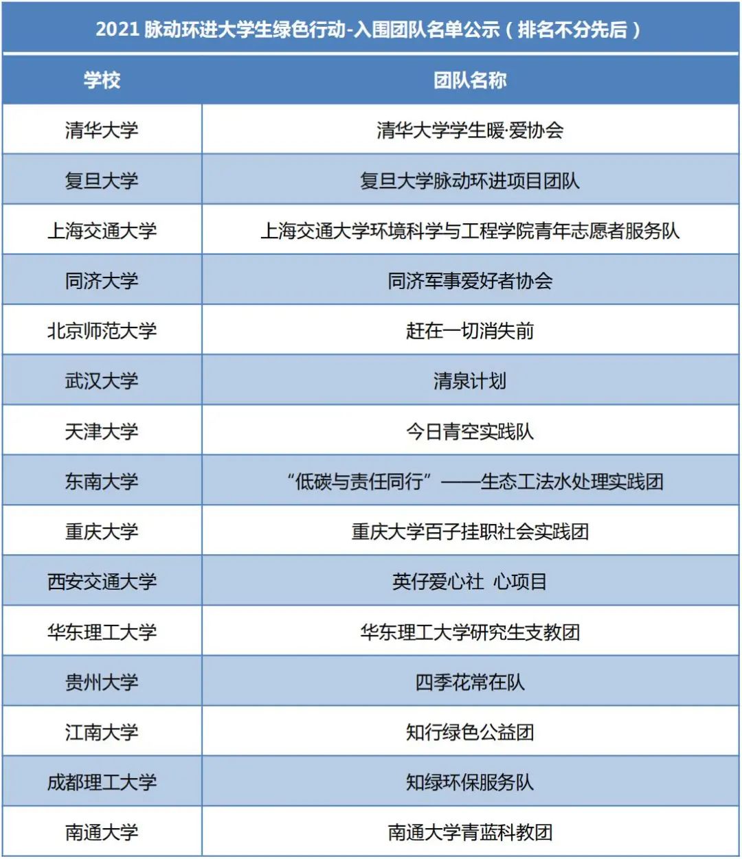 学生会、青年志愿者协会组成,来自清华大学、复旦大学等全国15所高校的团队入围决赛。