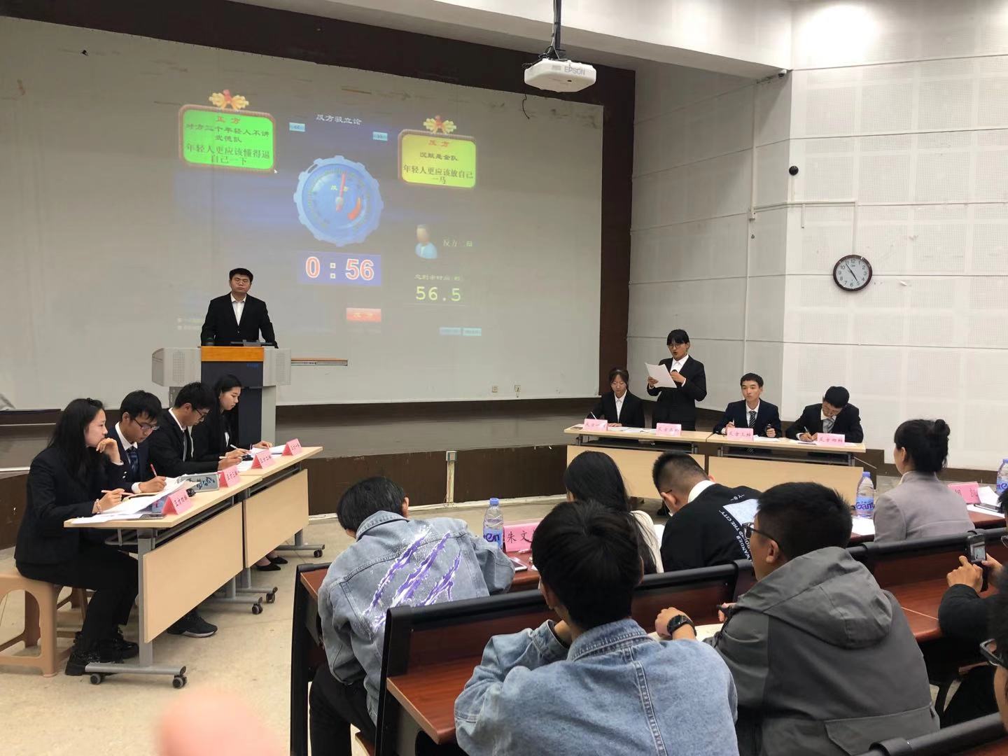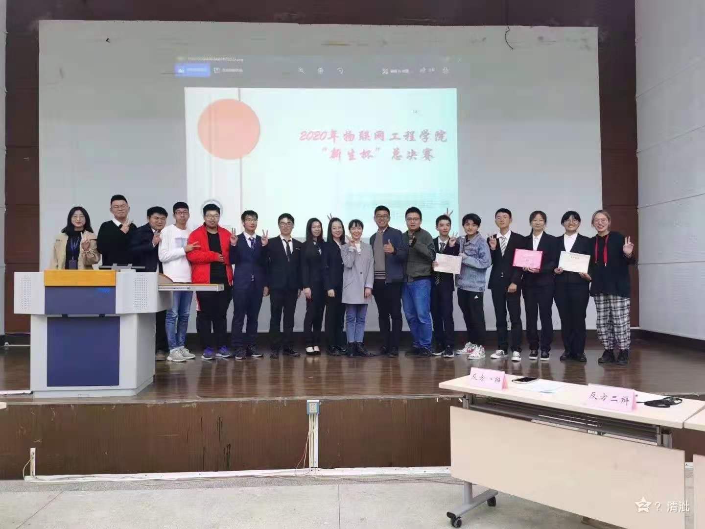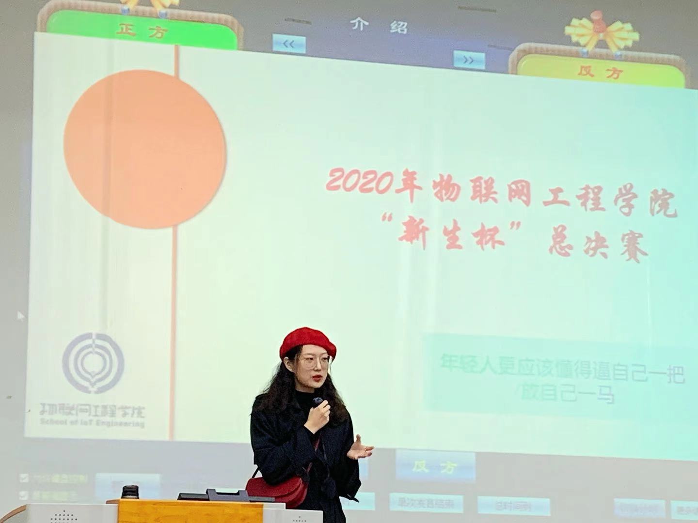 经过初赛和复赛的激烈比拼,来自自动化2006班的“不讲武德”队和物联网2003班的“沉默是金”队从16支参赛队中脱颖而出,晋级决赛。决赛现场,双方围绕辩题:“年轻人更应该懂得逼自己一把/放自己一马”,各抒己见,舌灿莲花。辩论开始后,双方辩手立场鲜明地摆出己方观点,正方一辩徐金宣同学指出懂得逼自己一下更有利于年轻人适应当代社会竞争模式,更有利于年轻人发展;而反方一辩刘贝妮同学则从社会压力的角度指出,年轻人在懂得努力重要性的情况下,更应该懂得释放压力。自由辩论环节,双方就当下年轻人的现状和年轻人应该抱有的态度展开激烈交锋。结辩环节,双方更是对对手的论点展开猛烈进攻,正方以大量的语境、举例限制对方的发挥,而反方也提出“内卷”一词开辟新战场,让人耳目一新,整个赛程高潮不断,掌声此起彼伏。
