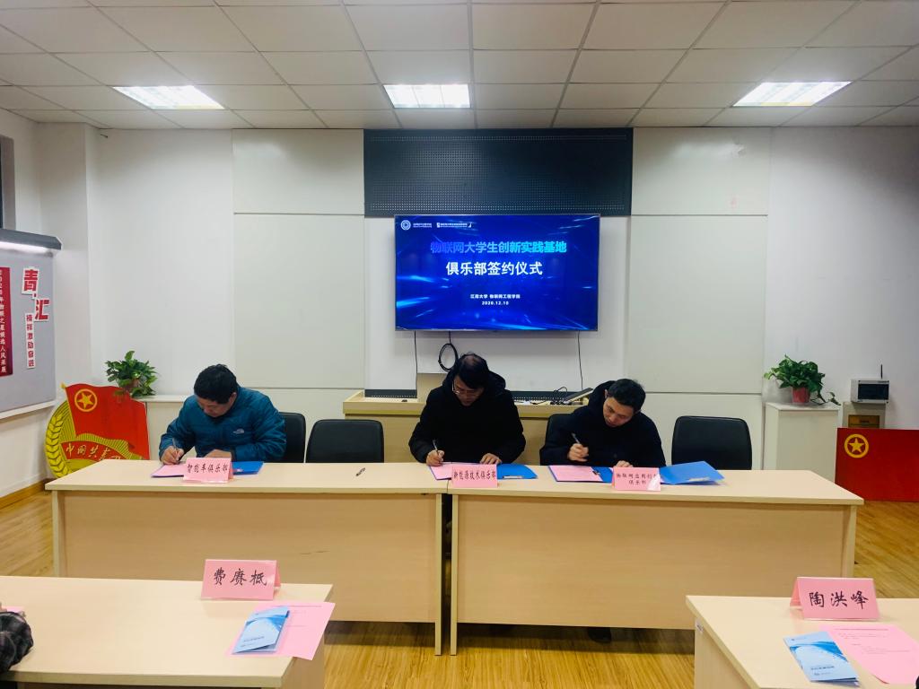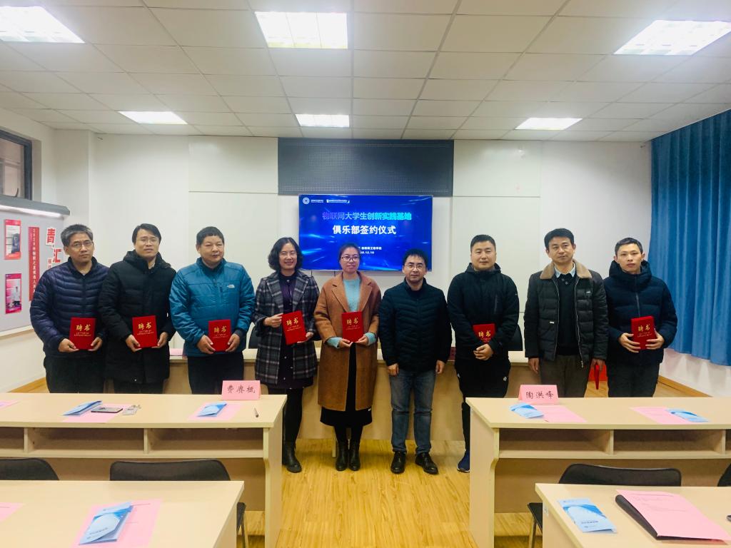 签约仪式上,费赓柢简要介绍了物联网大学生创新实践基地的基本情况,强调了基地实验室安全及管理制度。俱乐部责任指导老师分别签订《物联网大学生创新实践基地俱乐部设立协议书》,陶洪峰副院长向各俱乐部责任指导老师颁发了聘书,并与俱乐部负责老师进行交流。他向各俱乐部提出了三点希望,一是希望通过俱乐部积极进行创新实践教学体系的探索与实践,使学生的学习从“被动学习”、“独立学习”转变为“主动学习”、“创新学习”和“合作学习”;二是希望通过俱乐部进一步提升玩偶姐姐学科竞赛的水平,让学科竞赛引领学生成长。三是希望积极开展丰富多彩的科创活动,通过举办学术沙龙、科普讲座等活动,营造良好的创新创业氛围。