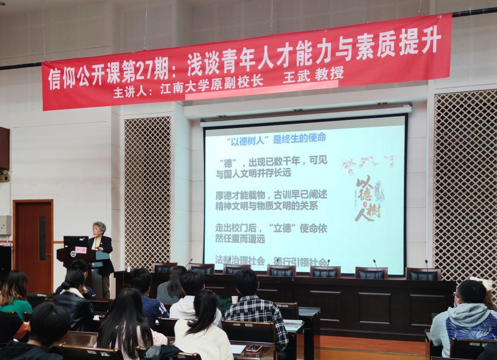 她从培养“国家栋梁、社会精英、企业骨干”的角度,从青年人才个人长远发展的角度,以精准而广博的凝练,勉励同学们成才路上需要把握的四个方面“厚德、强能、博识、精进”。并以此四个方面展开,以她丰富的人生阅历,严密的逻辑体系和深邃的思想境界,为同学们展开了一幅开阔而实用的素养修炼图谱。她讲到厚德在于要以思想政治理论为基本遵循和指导、要以增强品德廉政意识为基本修养、更要能够不断提升属于自己的独到的哲学思辨水平;她以自己多年的工作经历,系统讲解了筹谋力、决策力、领导力、执行力、排难力、创新力在人生奋斗中的重要意义和作用,并激励大家要能够全面发展,在实践中注重锻炼不断提高;她从科学、技术、文化、自然等方面例举做到博识方法和要义,并提到锻炼提取关键信息的重要性;最后,她从微观、中观和宏观三个层面,向同学们讲解了如何精进自身的实力水平,带领同学们深刻认识素养提升各方面、各领域、各层次的立体化格局,为同学们把握如何锻炼能力、提高本领、提升素养,提供了真知灼见又细致入微的解读。王武教授的讲座让同学们收获满满、受益匪浅,为青年学生修身养德注入源源不断的强大动力。