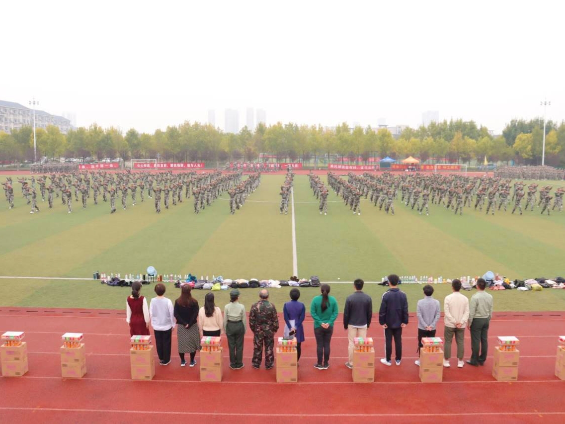 党委书记程捷音,院党委副书记、副院长孔丽丹,校人武部军事训练科科长韦红武,院分团委书记吴垚,带训辅导员和学生会主要学生干部一起来到西北操场,看望正在军训的教官和新生,并送上慰问品。