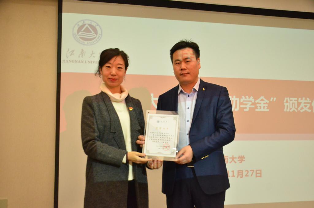 接着,窦新华宣读受奖助学生名单,共有20名学生获得本年度的“乾一助学金”。窦新华对全体受助学生讲述了娄宝安先生的创业经历,以及上海乾一化学品有限公司热心慈善的公益故事,希望物联学子能怀有感恩之心,积极行动回报社会,努力承担社会责任。随后,她向娄宝安先生颁发了捐赠证书,由娄宝安先生为受助学生一一颁发助学金。