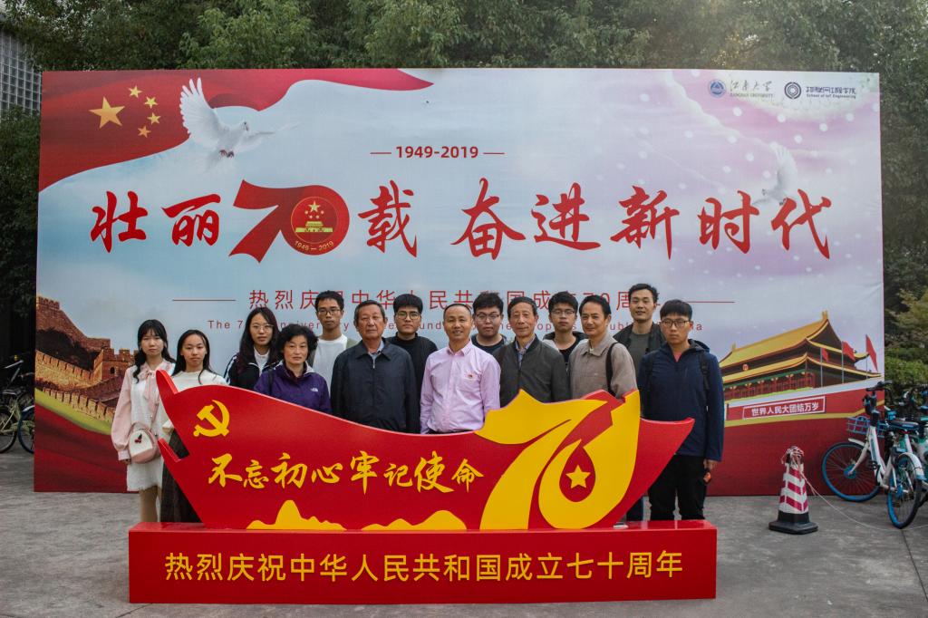 门口的“壮丽70年,奋进新时代”展板前合影留念,纪念这次十分有意义的活动。