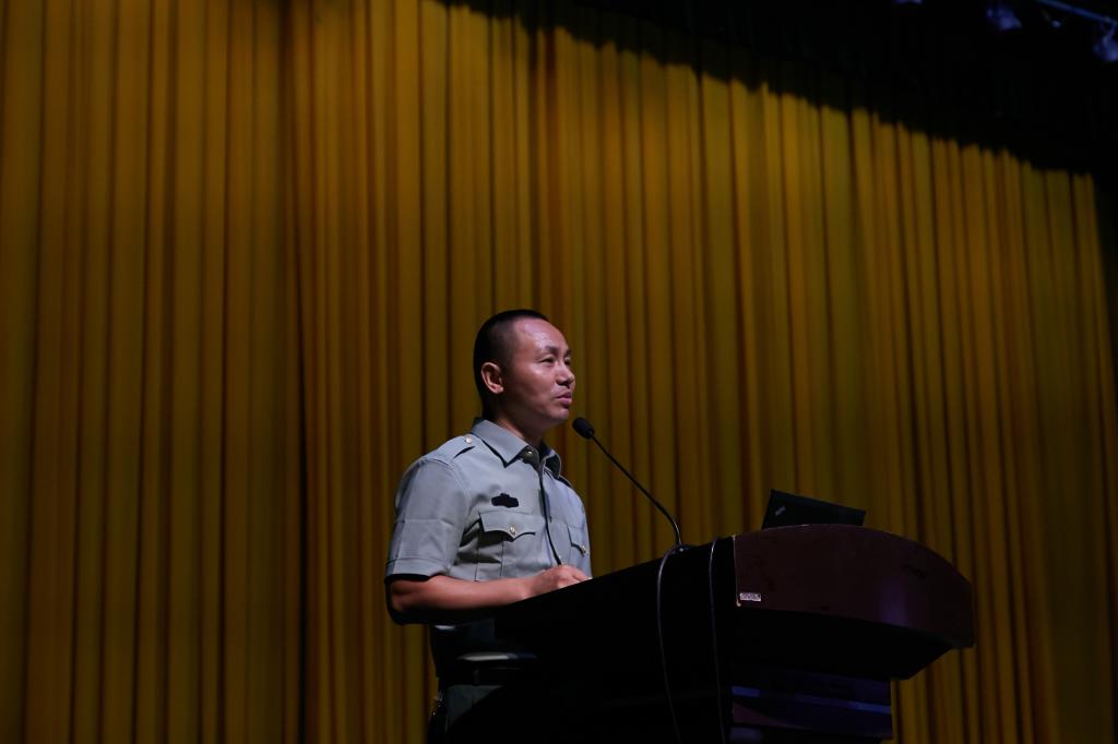 首先,全体参会人员起立奏唱国歌。随后,退伍学生代表宋含笑同学发言,她与在座2019级新同学分享了自己三个月的新训生活体会,就服役时的辛苦与幸福给予同学们心理上积极的引导。宋含笑同学入学后服役两年,对于服役的最大感触就是:“大学生当兵可能会后悔两年,但是不当兵可能会后悔一辈子。”接着,2019级参训学生代表马永同学上台发言,他表示在军训中一定会端正态度,把参加军训当做人生的必修课程,以昂扬向上的精神面貌投入到军训中,积极主动地迎接各种困难和挑战,展现江大物联人良好的精神面貌。
