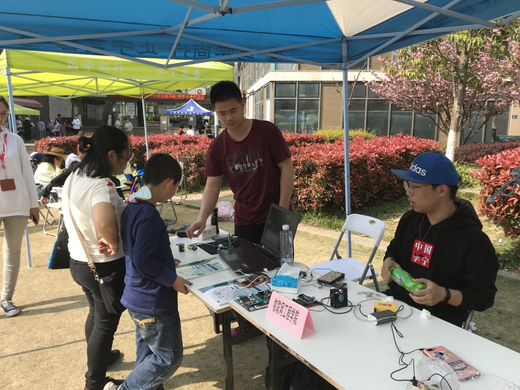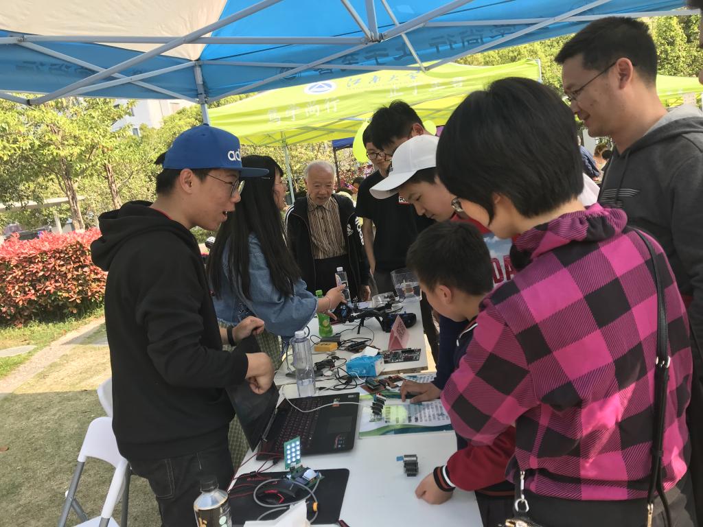 的展台展示了基于单片机开发的音乐喷泉,温湿度检测报警控温系统,电子密码锁,以及四翼无人机。玩偶姐姐同学热情地给前来参与的大朋友和小朋友们讲解了这些展品其中的原理、工作方式和可以实现的功能。相信通过此次活动能够在小朋友心中种下一颗科学的种子,它在将来会长成参天大树。