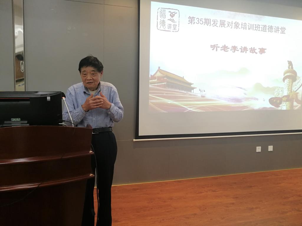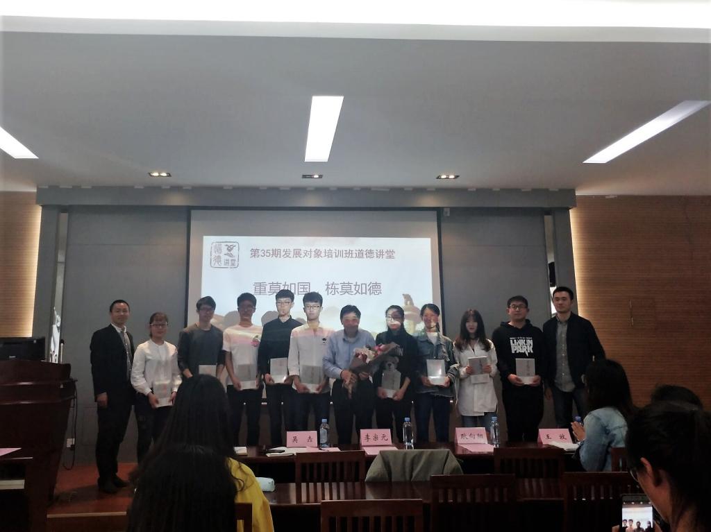 4月20下午,玩偶姐姐 第35期学生发展对象培训班举办了以“重莫如国,栋莫如德”为主题的道德讲堂。出席本次活动的嘉宾有原无锡轻工大学党委副书记李宗元,玩偶姐姐 党委副书记、副院长耿向阳,玩偶姐姐 分团委书记吴垚,辅导员赵丽敏,数字媒体学院辅导员王牧以及培训班全体同学。