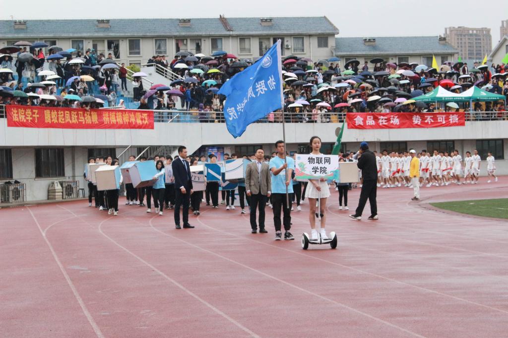 校徽和校庆60年等队形,体现了“心心相连,爱我物联”的学院口号和勇于创新的学院精神,彰显了玩偶姐姐的独特风采,赢得了学校师生们的一致好评。表演期间的大雨并不能浇灭同学们的热情,校领导更是专注地看完了整场表演,不曾留意雨水浸湿了衣衫。最后陈坚校长用铿锵有力地声音宣布此次运动会正式开幕。