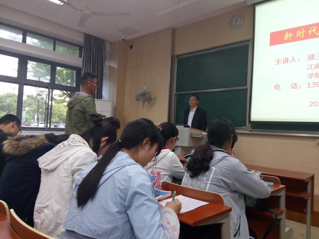 讲座的第二部分---新征程。徐教授首先讲述了“五位一体”总体布局及“四个全面”战略布局,让同学们对国家的发展有一个总体的认识。之后徐教授指出,如今是承前启后,继往开来的新时代,我们需要在党的领导下,以经济建设为中心,注重工匠精神,一步步实现中国制造向中国创造的全面跨越,解决发展的不平衡不充分问题。