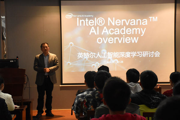 ,他们会请到人工智能的合作伙伴来为大家讲解他们眼中的人工智能,以便学生能够更好地理解什么是人工智能。他通过一些具体事例向同学们表明人工智能就在我们的身边,我们生活中的许多领域都与人工智能有了相应的结合点,例如医疗、财政、能源、以及交通等,人工智能已经无处不在。他对AI人才培训瓶颈的突破、对人工智能的创业机遇提出了独特的见解。他还带着英特尔人工智能领域的专业知识与到场同学一同进行了深度的学习研讨:以数据科学与机器学习,和神经网络与深度学习两个专业理论问题为主要讨论点,深入并全面地讲解了理论知识及理论与实例的结合运用。他表示,他们发布了面向人工智能的因特尔软件®学生开发人员计划,旨在重点展示学生与英特尔学生大使的专业知识、活跃思维和创新精神,及他们使用因特尔架构的成功经验,从而让学术界更多地了解人工智能,更广泛地采用这一技术。
