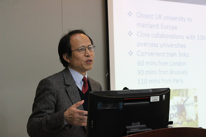 的学生介绍英国肯特大学,以及肯特大学的研究生课程。肯特大学优美的环境,良好的学术氛围吸引着前来参加讲座的同学。紧接着,王教授以风趣幽默的风格开始了通信与计算融合的讲座。王教授以小区通信网络为例,生动形象地讲述了未来移动网络的特点及移动通信与计算融合趋势,给出通信技术虚拟化、移动网络动态缓存、移动网络需要运行中优化的结论。讲座结束后,王教授与同学们热情互动,为同学介绍了英美国家与中国物联网的发展,解答了同学们对物联网与通信及时的问题。