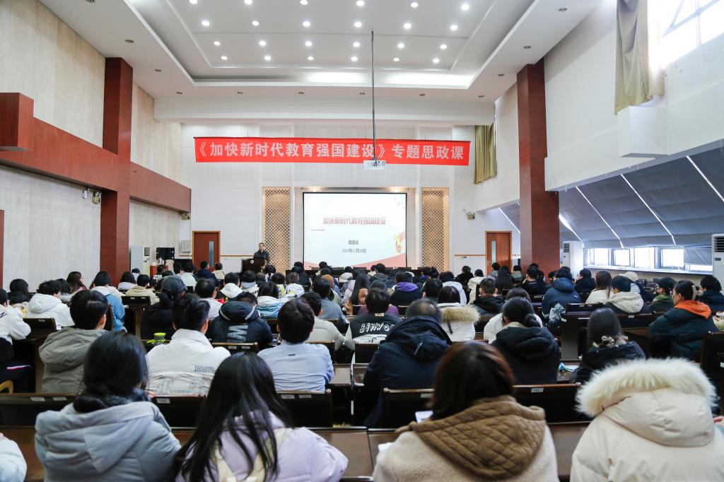 堵国成以《加快新时代教育强国建设》为题讲授思想政治课。他以党的二十大报告作为切入点,围绕国际竞争、科技需求、社会发展、教育格局、传统思维、人口结构等六个方面,分析和梳理我国建设教育强国存在的挑战,指出实现从教育大国向教育强国的跨越依然任重道远。接着,从回归使命、回归本源、坚定信心、超期布局、聚焦本然五个维度,通过图文并茂的形式,多角度、全方位、立体化地解读了教育强国的重要意义、基本内涵、坚实基础、发展目标和推进路径。同时,结合玩偶姐姐