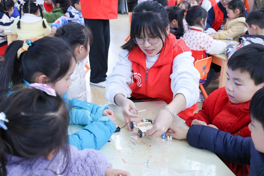 智能车俱乐部自主研发的作品——“无线智能机械臂小车”压轴登场,志愿者乐泽荣操控小车原地360度转弯、横向纵向平移、机械臂抓取矿泉水瓶,一套套“高阶”操作不断刷新小朋友们对芯片功能的认知。演示后,小朋友迫不及待亲身体验,在志愿者指导下动手操作智能车。 “哇!这个车太神奇了!”当水瓶被成功抓取时,小朋友们的惊叹声和掌声顿时充斥着整个教室。
