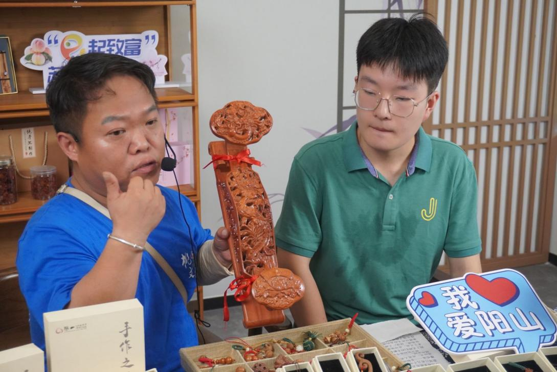 在互联网时代,这群手工艺人除了埋头提升雕刻技能外,也抓紧时间学习新知识、掌握新技能,开拓电商助残新方式。他们先后创建桃文化残疾人创客中心公众号、视频号和抖音号,制作发布短视频、直播带货等。实践团成员在参观结束后,主动变身“小主播”,为桃文化产品代言。“桃的寓意主要涵盖长寿、幸福、团圆和吉祥,而这件用桃木雕刻而成的如意更是象征的吉祥如意与心想事成。”实践团成员在直播间认真仔细讲解着产品的细节,绘声绘色讲述每一件桃木工艺品背后蕴含的美好祝愿。