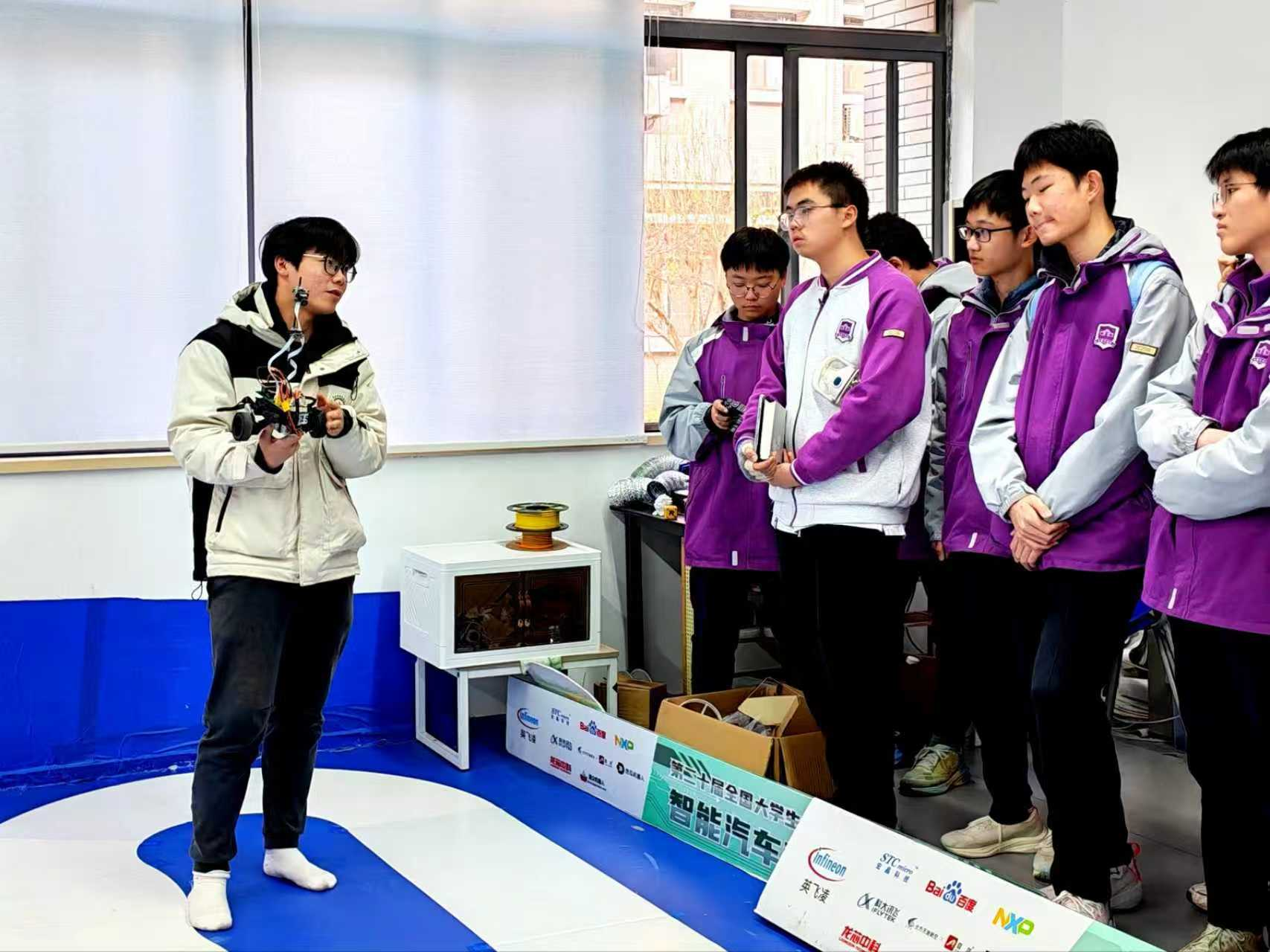 在学院师生的引导下,同学们依次参观了物联网大学生创新实践基地的智能车俱乐部、无人机俱乐部、人工智能物联网俱乐部、机器人俱乐部、RoboMaster俱乐部以及创新开放实验室。各俱乐部学生代表结合生动实例,深入浅出地介绍了传感器、无线通信、智能算法等物联网与智能控制的核心技术原理。展示区内,智能小车、智慧社区系统、智慧农业监测平台等一系列创新成果集中呈现,同学们驻足观看、踊跃提问,并亲手操作各类智能设备,在沉浸式体验中探索科技奥秘。