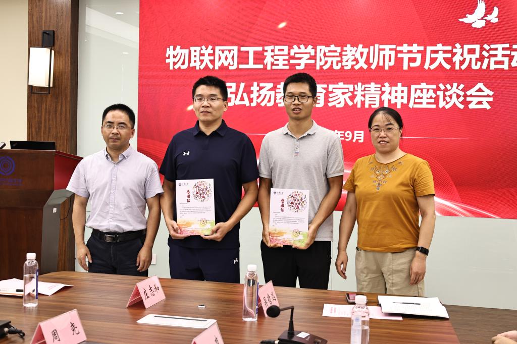 在第41个教师节来临之际,为深入学习贯彻习近平总书记关于教育的重要论述,进一步凝聚立德树人共识,9月9日上午,物联网工程学院在B222会议室举行教师节庆祝活动暨弘扬教育家精神座谈会。校关工委青年教师导师杨慧中、学院领导班子成员、系主任及青年教师代表等20余人参加会议。会议由学院副院长陶洪峰主持。