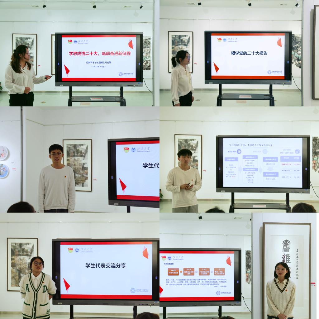 为学习贯彻党的二十大精神,凝聚奋进新征程谱写新篇章的强大力量,11月中旬,物联网工程学院控制科学与工程硕士党支部在钱绍武艺术馆开展“学思践悟二十大 砥砺奋进新征程”主题党日活动。校工会主席黄壮霞到场巡听旁听,物联网工程学院党委书记程捷音、副书记孔丽丹,党建辅导员张圆及支部党员共同参与了活动。活动由学生党员沈桠楠主持。