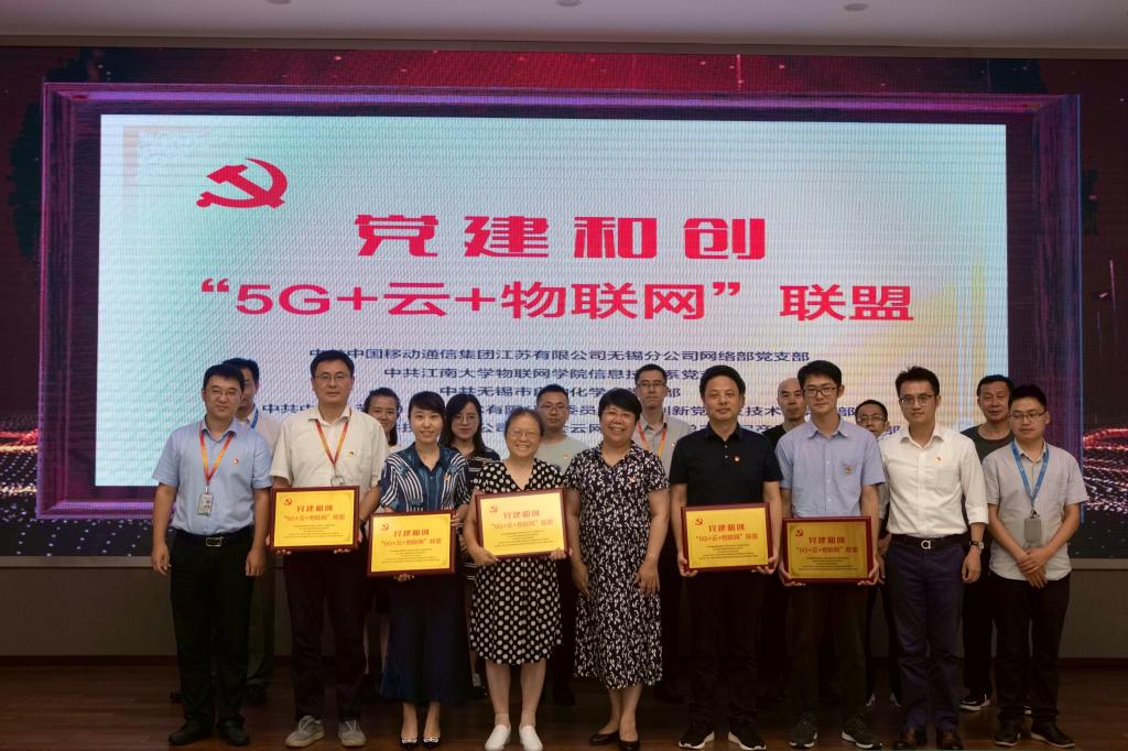 为深入学习贯彻落实习近平新时代中国特色社会主义思想和党的十九届五中全会精神,认真落实新时代党的建设总要求,持续强化党建引领发展、聚力发展、融合发展,不断激发基层党组织工作活力,充分发挥党组织的战斗堡垒和党员的先锋模范作用,2021年9月7日下午,江南大学物联网工程学院信息技术党支部联合无锡市自动化学会党支部、中国移动通信集团江苏有限公司无锡分公司网络部支部委员会、中移(苏州)软件技术有限公司委员会云网产品部党总支云网产品部第三党支部、中移(苏州)软件技术有限公司委员会技术创新党总支技术部党支部,联合开展了“5G+云+物联网”联盟党建和创主题实践活动,现场完成了揭牌仪式和签约。