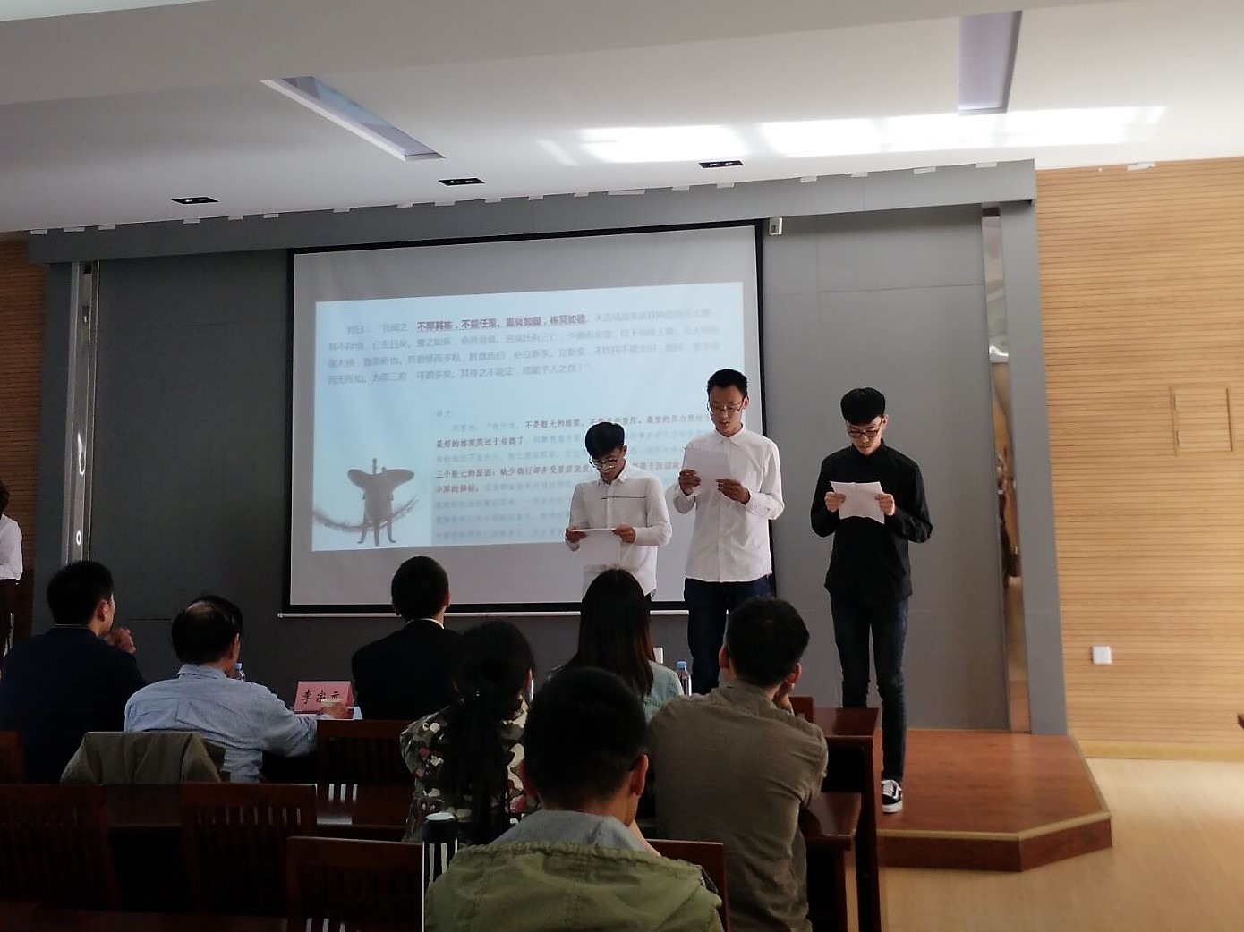 道德讲堂分为“诵经典”、“学模范”、“发善心”、“唱歌曲”、“劝善词”、“送吉祥”六个部分。首先由物联学子诵读《国语·鲁语》节选,雄壮浑厚的诵读声令人陶醉。 在“学模范”环节,主持人用短片介绍了卢永根——一个把国家扎根在心里的科学家。讲堂的第三项是“发善心”,数媒学院的同学为大家一一介绍了各位道德模范代表:江南大学法学院的热爱环保 、热心公益的盖中辉教授;“最美反扒夫妻”--人民警察周小明和李彩英;自立自强、把“发展残疾人事业,安置盲人就业”作为事业发展的核心的盲人严三媛。在“唱歌曲”环节中,物联学子带来歌曲《我爱你,中国》。歌词字里行间流露出炽热的爱国挚情,那一声声的“我爱你,中国”令在场师生心潮澎湃。