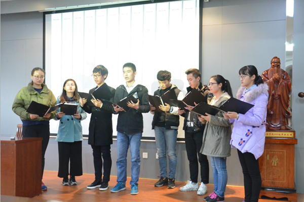表演过后,程勉中老师为同学们开展了以“国学与社会主义核心价值观”为题的讲座。程老师首先向同学们解读了国学的基本内涵。其次,他指出,国学的传统文化精华是涵养社会主义核心价值观的源泉,例如“自强不息、以和为贵”等思想是“富强、民主、文明、和谐”这一国家层面价值目标的源泉,“仁爱、中正、天下为公”等思想是“自由、平等、公正、法治”这一社会层面价值目标的源泉,“忠、义、诚、信、礼”等思想是“爱国、敬业、诚信、友善”这一公民层面价值目标的源泉。从国学到社会主义核心价值观,不同层次不同内容的“道德遵循”是主要价值追求之一。最后,程勉中老师表示,希望同学们在身心的维度追求“道以养生”,在情感的维度追求“诗以抒情”,在道德的维度追求“儒以涵德”,在智慧的维度追求“慧以净心”,以校训“笃学尚行、止于至善”为引领,培养好德性,坚守好德行,做社会主义核心价值观的践行者。
