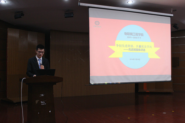 为更好地促进物联网工程学院的优良学风建设,弘扬积极进取的学习精神,有效激发学生自我管理、自我教育、自我服务的潜能,充分的发挥朋辈的示范、引领、互助的作用,11月14日晚18:30,物联网工程学院“争创先进班级,共赢优良学风”先进班集体评选活动在北区大学生活动中心音乐厅隆重举行。物联网工程学院党委副书记、副院长耿向阳,分团委书记胡娟,以及各年级辅导员、班主任出席了本次活动,并担任评委。学院共14个班级参加本次评选, 60多个班级到场观摩学习。