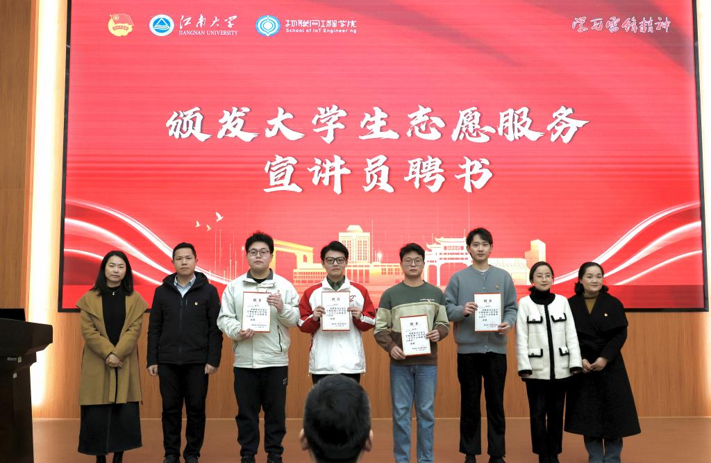 党委副书记吴妍、无锡市滨湖区团委副书记肖江,校学生工作处学生管理科科长杨艳共同为四位优秀的物联追“锋”者颁发“大学生志愿服务宣讲员”聘书,激励四位宣讲员肩负起传播志愿服务精神的重任,以自身经历激励更多同学投身志愿服务。