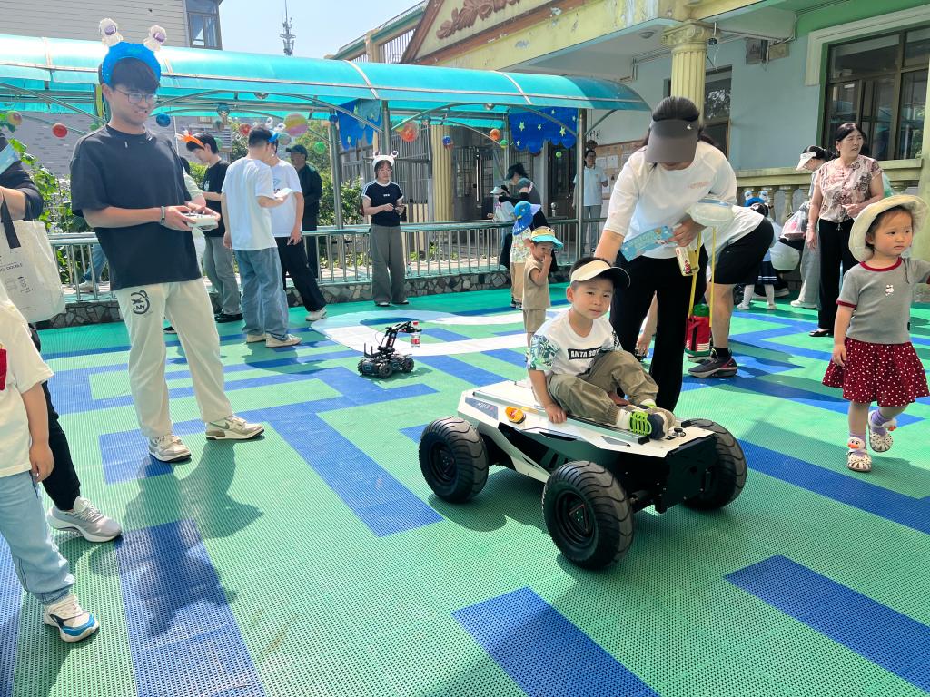 在互动体验区,孩子们亲身坐上智能车在赛道上行驶,亲手操控智能车抓取塑料瓶,并尝试指挥机器狗完成跳跃。每一次成功的操作都伴随着孩子们的欢呼与专注观察,这些亲身体验让他们更直观地感受到了科技的魅力