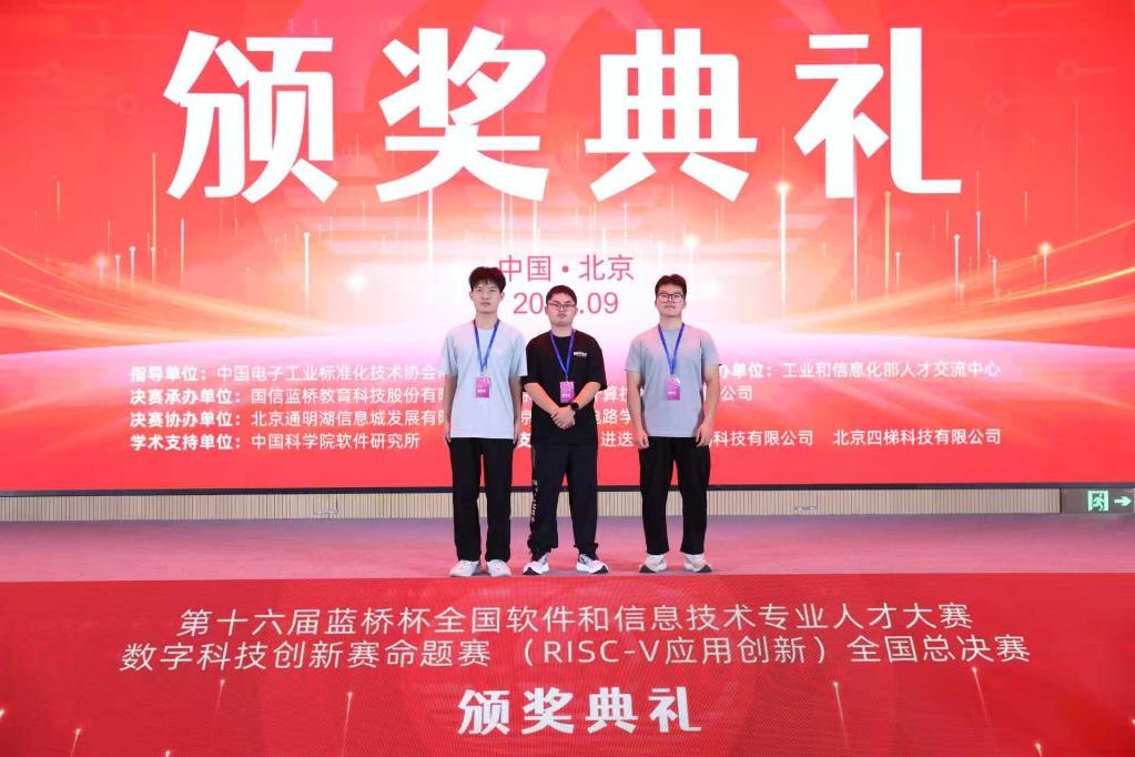 近日,由工业和信息化部人才交流中心主办、中国电子工业标准化技术协会RISC-V工作委员会承办的第十六届“蓝桥杯”数字科技创新赛命题赛(AIoT场景应用)全国总决赛在北京圆满落幕。在物联网工程学院刘相、马浩老师指导下,由李佳澳、付云鹏、刘康硕三位本科生组成的团队,凭借面向工业互联网智能制造场景研发的作品《二维码导航自动顶托AGV小车》,荣获全国一等奖,为学校在AIoT应用创新领域再添佳绩!