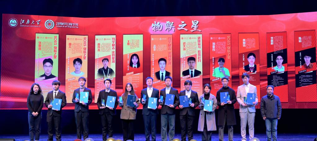 “思锐”集体奖学金和“物联之星”颁奖环节,吴妍、陶洪峰为2025年“物联之星”颁发荣誉证书,王子赟、周彪、毕恺韬为思锐先进集体、班集体颁发荣誉证书。青山灼灼,星光致远,身边的榜样正激荡起前行的磅礴力量。