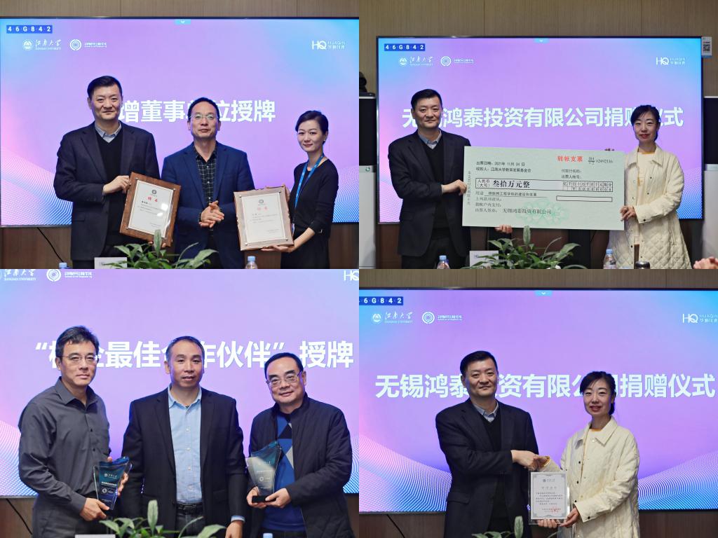 接着,举行捐赠、聘书颁发及授牌仪式。无锡鸿泰投资有限公司向江南大学教育发展基金会捐赠30万元支持物联网工程学院学科建设,窦新华接受捐赠支票并为企业颁发捐赠证书。按照《江南大学物联网工程学院董事会章程》规定,大会对董事会成员进行了增补,新增无锡鸿泰投资有限公司董事长潘旭翔为副董事长、华勤技术股份有限公司人力资源副总裁阮泉为董事,堵国成为新增董事会成员颁发聘书。谢林柏为无锡信捷股份有限公司、英飞凌科技(无锡)有限公司颁授“校企最佳合作伙伴奖”,感谢两家企业十数年的持续合作和助力支持。